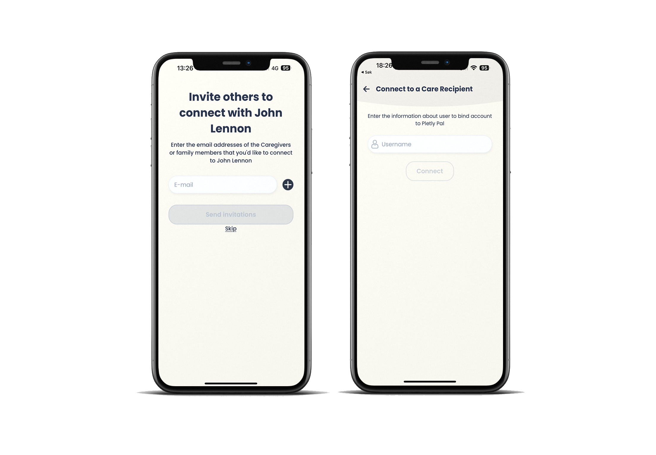 Connecting caregivers and care recipients can be done as a part of the registration process where you can invite caregivers to connect to the care recipient's account, or you can, as a caregiver wanting to connect to a specific care recipient, do this from inside the application. The screen below and to the left shows where you can invite caregivers to connect. Enter the e-mail address of the caregiver, and if they are not a Pletly user, they will receive an invitation to download and register in the app. If they register with the same e-mail address as the received invitation, they will automatically be connected when they have registered their caregiver account.
