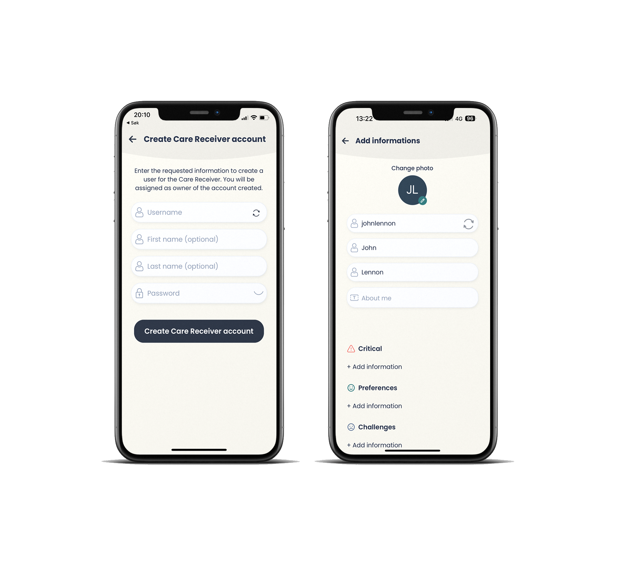 The screen below and to the left shows the registration form for creating a new care recipient. Here, "Username" is required as this is the unique identifier when connecting to caregivers. First name and last name are optional, as there may be a desire to anonymize the care recipient. Also, enter a password that can be used if the care recipient is to log in to one of Pletly's applications in the future.